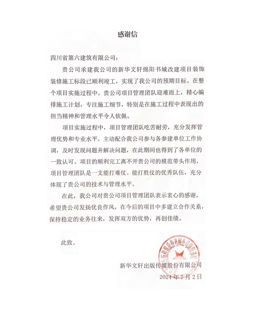 “在整個(gè)項(xiàng)目實(shí)施過(guò)程中,貴公司項(xiàng)目管理團(tuán)隊(duì)迎難而上,精心編排施工計(jì)劃,專(zhuān)注施工細(xì)節(jié),特別是在施工過(guò)程中表現(xiàn)出的擔(dān)當(dāng)精神和管理水平令人欽佩……”7月2日,公司收到一封來(lái)自新華文軒綿陽(yáng)書(shū)城的感謝信,字里行間都流露出對(duì)公司踐行國(guó)企擔(dān)當(dāng)?shù)馁澰S和對(duì)項(xiàng)目管理團(tuán)隊(duì)的肯定,并對(duì)今后的合作寄寓美好期待。