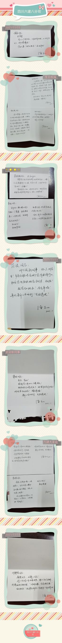 分公司總經(jīng)理雷學(xué)權(quán)代表分公司親筆為每位壽星送上生日祝福:“晏銘駿同志@loveyun,本來到了機(jī)關(guān)就能更多的照顧家庭了,不想分公司承接了大工程,您高興之余,又被“下放到老地方”,抱歉了 !本月是您的生日,誠祝生日快樂!明年是虎年,希望您響應(yīng)黨中央的號召,抱上大虎娃!”十位壽星十分祝福。真誠而具有親和力的祝福體現(xiàn)著分公司領(lǐng)導(dǎo)對項目員工的備至關(guān)懷。