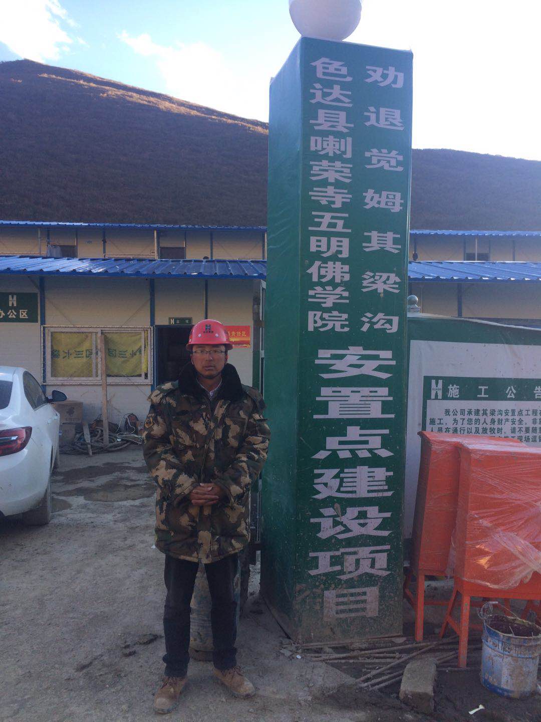 “小余,今晚上安排機械把8#.9#樓外墻板轉到樓層上去,明天開始組織人員進行安裝。”剛到海拔4300米的施工現場,就聽到他在用對講機講道。1米8的個子,身材魁梧,皮膚曬得黝黑,但在他嘴角的周圍卻紅了一圈,看上去格外的顯眼,后來才知道,原來是他的嘴角無法適應色達地區干燥的氣候,發炎了,每說一句話,他的嘴角就會感覺一絲疼痛。