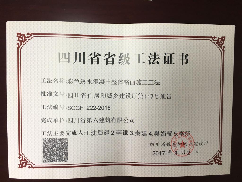 同時彩色透水砼整體路面施工工法、彩色生態透水整體路面彩繪施工工法分別在四川省綿陽水利電力學校災后異地重建工程和綿陽市科技城國際會展中心工程得到了成功應用,改善城市生態環境,為構建海綿城市建設、提高道路在城市景觀美學做出貢獻。
