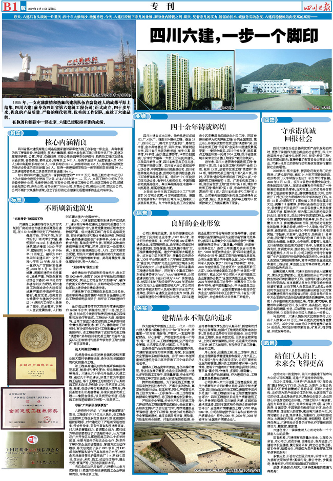 1965年,一支充滿激情和熱血的建筑隊(duì)伍在富饒迷人的成都平原上結(jié)集,四川六建(前身為四川省第六建筑工程公司)正式成立。四十多年間,優(yōu)良的產(chǎn)品質(zhì)量、嚴(yán)格的現(xiàn)代管理、優(yōu)秀的工作團(tuán)隊(duì),成就了六建品牌。